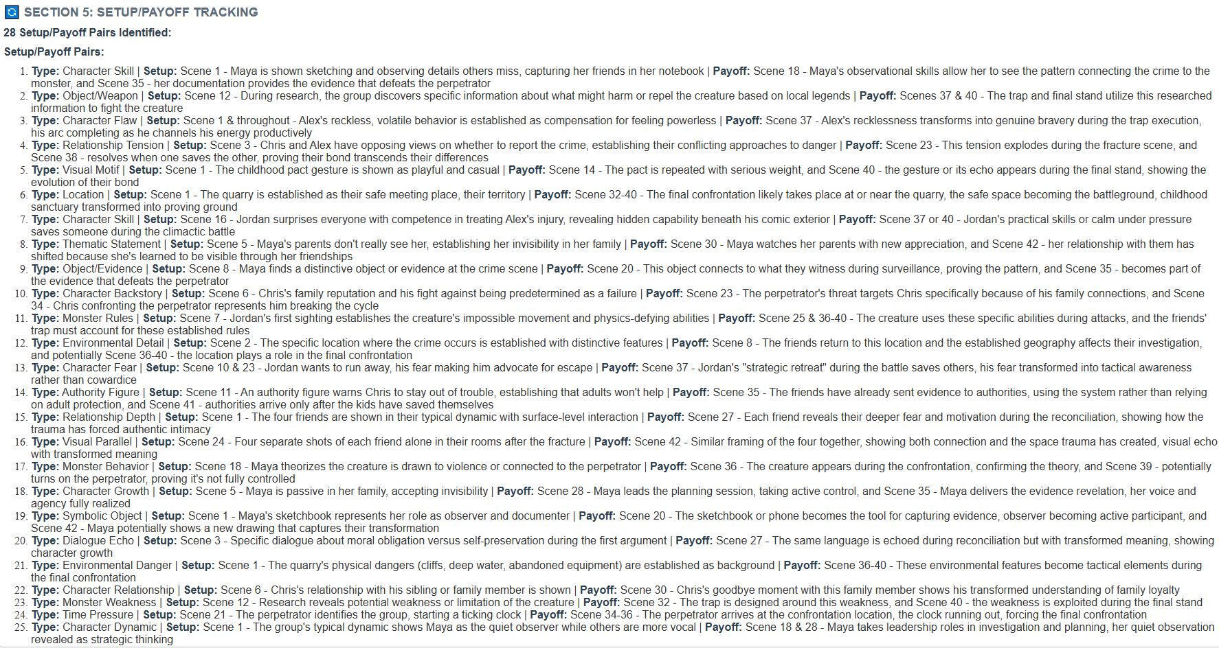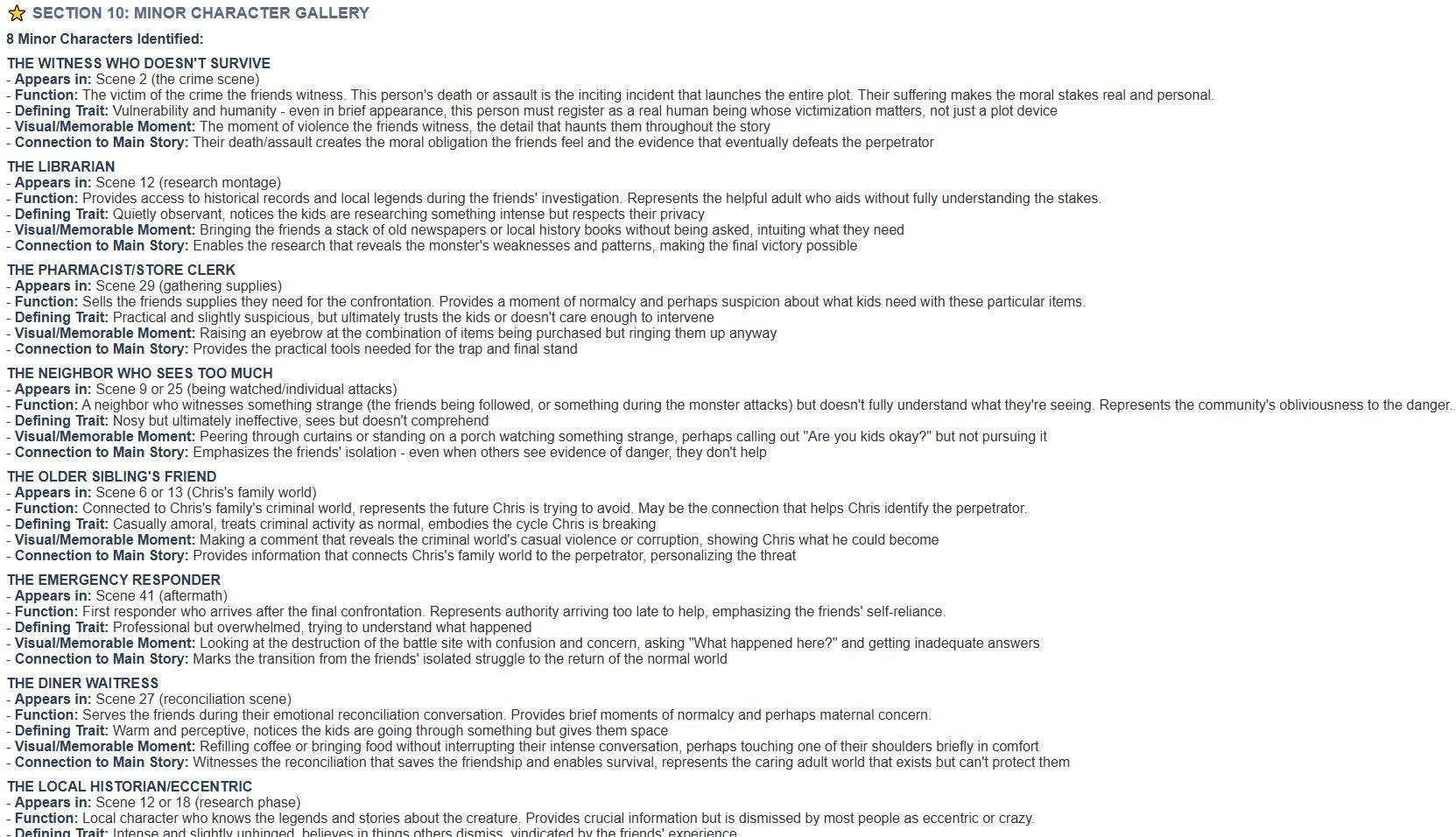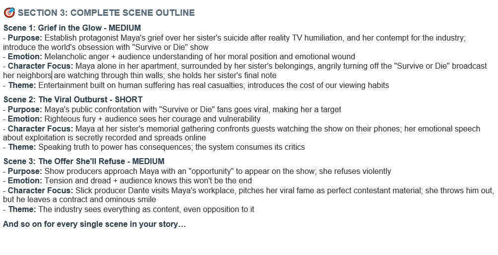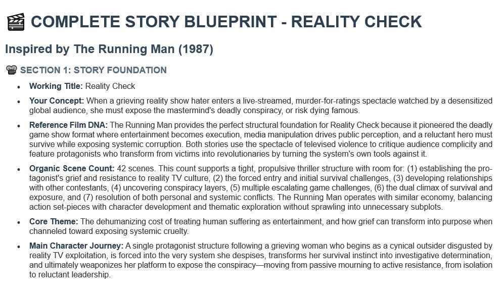 ⬇️ Here’s exactly what’s inside your blueprint.🗺️ Scene by Scene Roadmap — purpose, theme, characters and emotional goals.📏 Scene Length Guide — every scene tagged short, medium, or long for pacing clarity.🎯 Full Beat Mapping — inciting incident, midpoint, climax, all mapped.🚶 Character Arc Tracker — main and supporting transformations, step by step.💥 Antagonist Escalation Plan — rising stakes, scene by scene.👥 Minor Character Injection — seeded into scenes for texture and world-building.⛓️ Setup & Payoff Tracking — where to place for tight, satisfying storytelling.♻️ Motif Evolution — reveals how repeating patterns transform into powerful emotional payoffs.❤️ Subplots & B‑Story Analysis — depth and resonance beyond the main story.🧬 Thematic Core & Film DNA — your story’s deeper meaning revealed.🎭 Genre Compass — ensures your story delivers the promises of its genre.🎢 Audience Emotional Journey — the rhythm that keeps viewers hooked.📊 Pacing & Tension — exact points where tension rises and falls.🕰️ Timeline Progression — maps your story’s evolution across days, years, or generations.🎨 Tone & Mood Tracker — keeps your story’s atmosphere consistent from start to finish.🧩 Reference Film DNA — adapt structural lessons from any film you love to your own story.⚡ Writing Guidance — actionable tips and reminders for scene purpose and emotional goals.🚀 “Start Here” Roadmap — your first step to conquer that blank page.📄 Delivered as a beautiful HTML blueprint — 25 pages of detailed professional analysis.